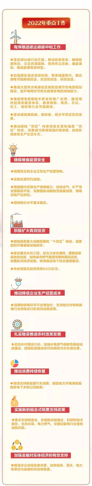政府工作報告列出2022年的重點工作包括:有序推進碳達峰碳中和工作。落實碳達峰行動方案。推動能源革命,確保能源供應,立足資源稟賦,堅持先立后破、通盤謀劃,推進能源低碳轉型。加強煤炭清潔高效利用,有序減量替代,推動煤電節能降碳改造、靈活性改造、供熱改造。推進大型風光電基地及其配套調節性電源規劃建設,提升電網對可再生能源發電的消納能力。推進綠色低碳技術研發和推廣應用,建設綠色制造和服務體系,推進鋼鐵、有色、石化、化工、建材等行業節能降碳。堅決遏制高耗能、高排放、低水平項目盲目發展。推動能耗“雙控”向碳排放總量和強度“雙控”轉變,完善減污降碳激勵約束政策,加快形成綠色生產生活方式。確保糧食能源安全。繼續支持新能源汽車消費。